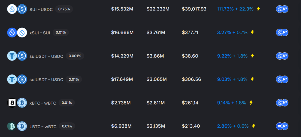| SUI / USDC | 0.2% | 192.23% | 約$15.6M | 安定&定番ペア |