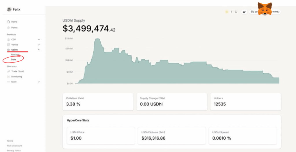 この Stats(統計)画面 では、USDhl の流通量や利用状況、APY(利回り)など、重要なデータをまとめて確認できます。