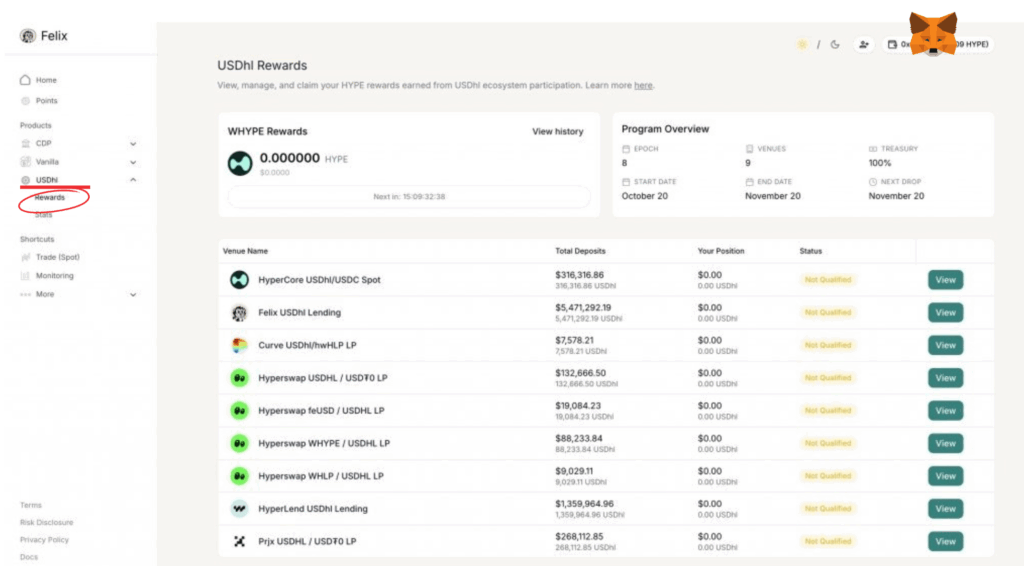 USDhI:Rewards は、USDhI を貸したり、LPを提供したりすることで得られる“HYPE報酬”を確認するページです