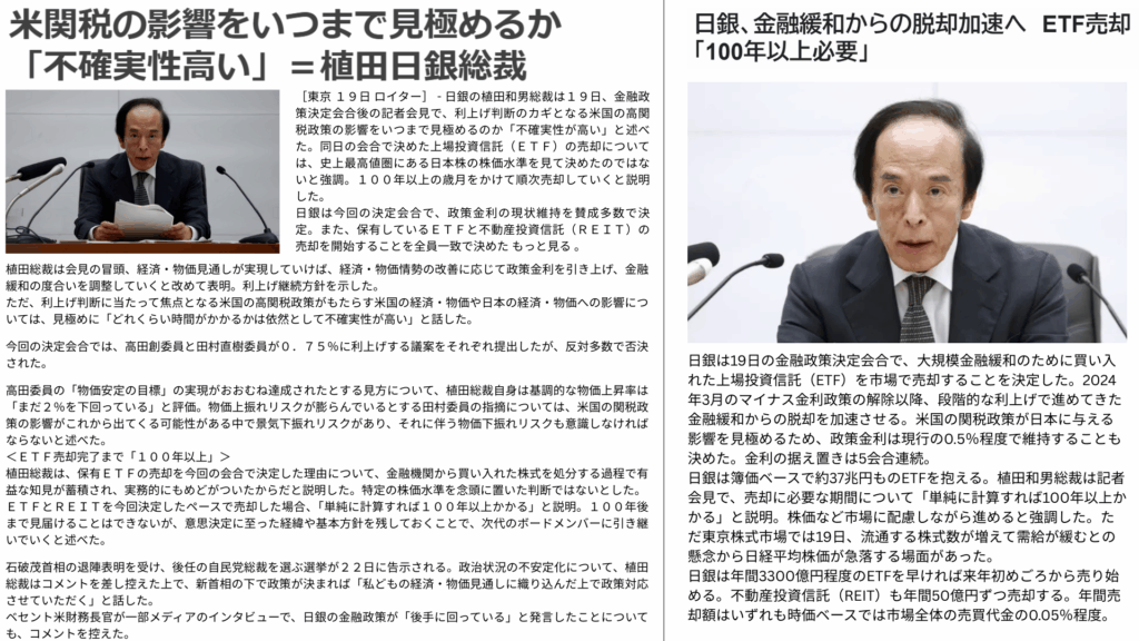 → 追加利上げは見送り。これで5回連続の据え置き。 - ETF(上場投資信託)の売却を開始