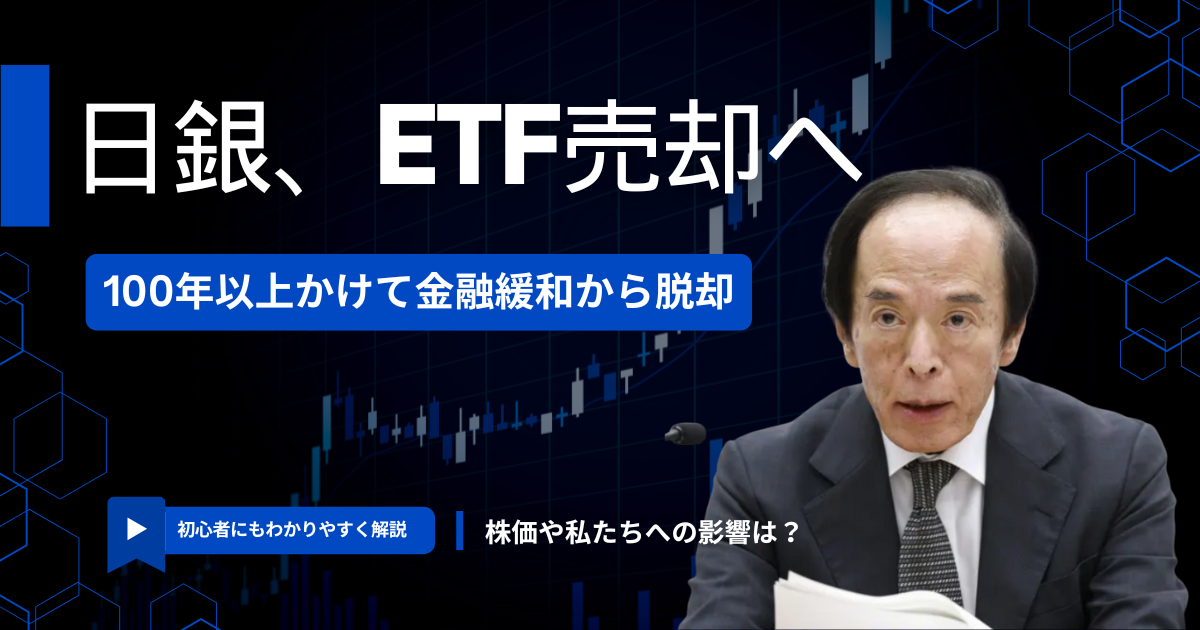つまり、日銀が持つETFはあまりに巨大で、一気に売ると株式市場が大きく混乱してしまうため、超ゆっくり時間をかけて処分していくということです。