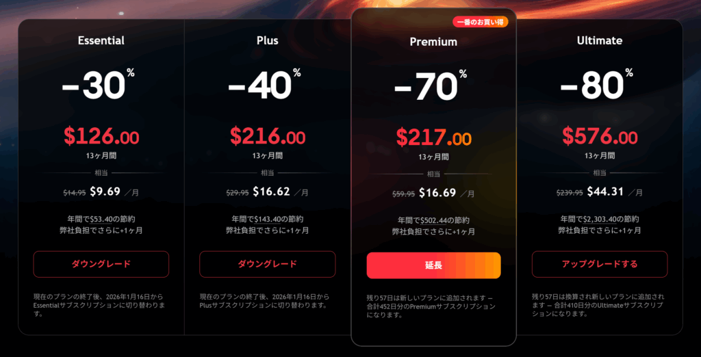 ブラックフライデー割引価格の決済画面に進む - 購入すると、現在の契約期間に 割引価格の13ヶ月が追加 される