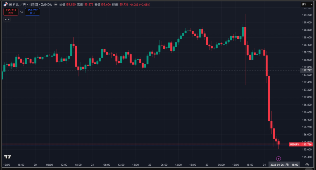 158.227円 → 155.6円付近まで急落し、そのままNY引け
