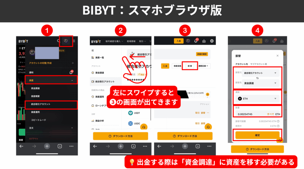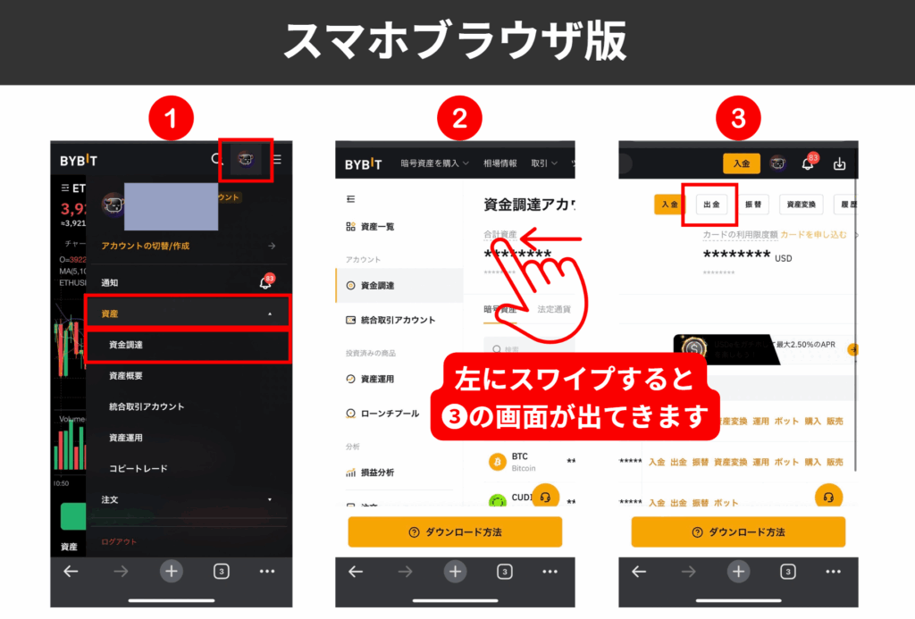 2.「資産」⇒「資金調達」⇒「出金」を押す