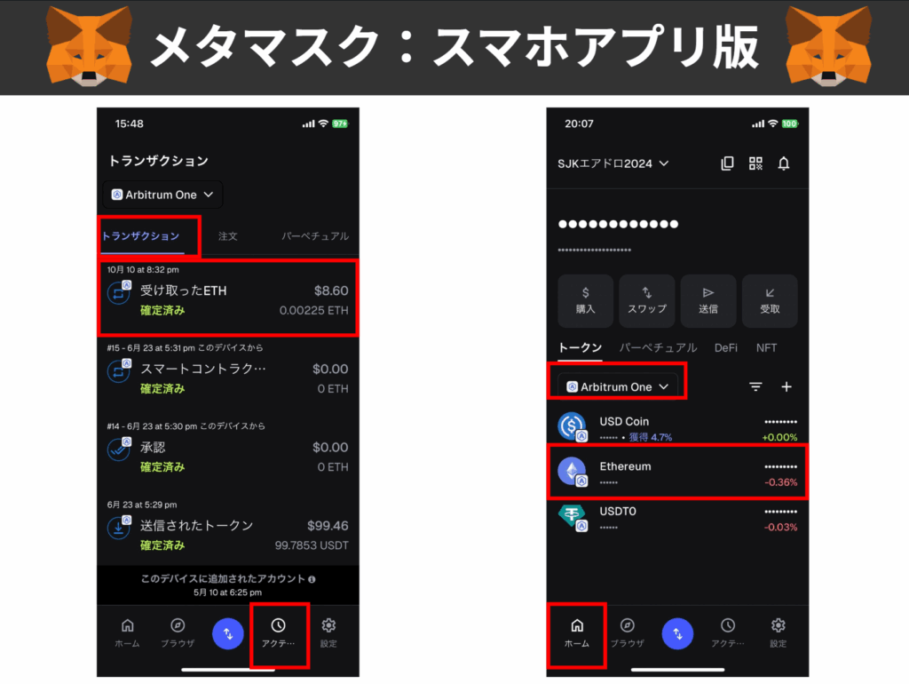 ⇒ 「アクティビティ」に“受取りました(受取った)ETH”の記載があればOK