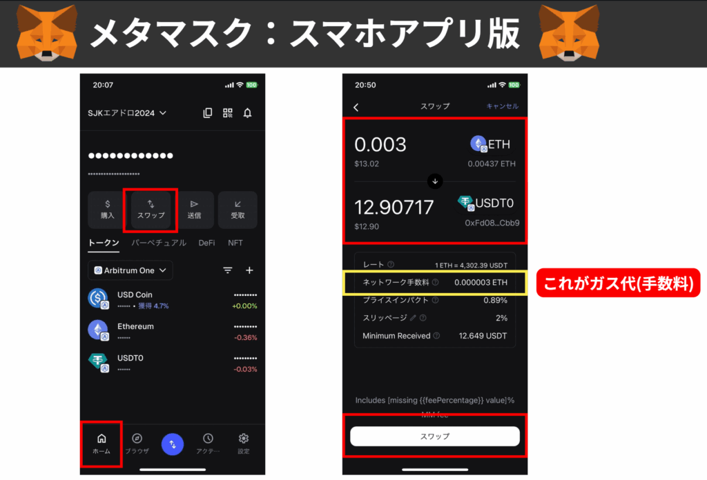 注意:スワップには少額のガス代(手数料)が必要です。ネットワークによって金額が異なります。