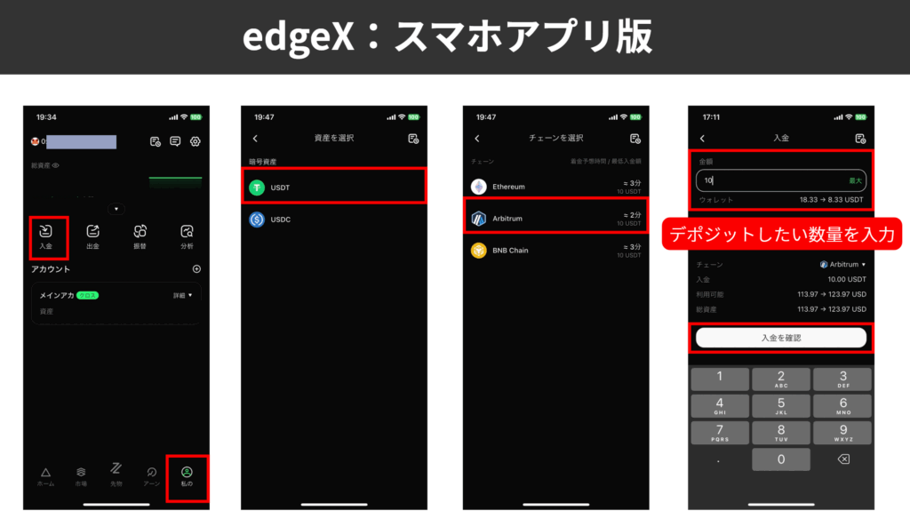 また、edgeXへの最低デポジット数量が10 USDT~となるので、スワップをする際は10 USDT以上になるようにスワップしていきましょう。
