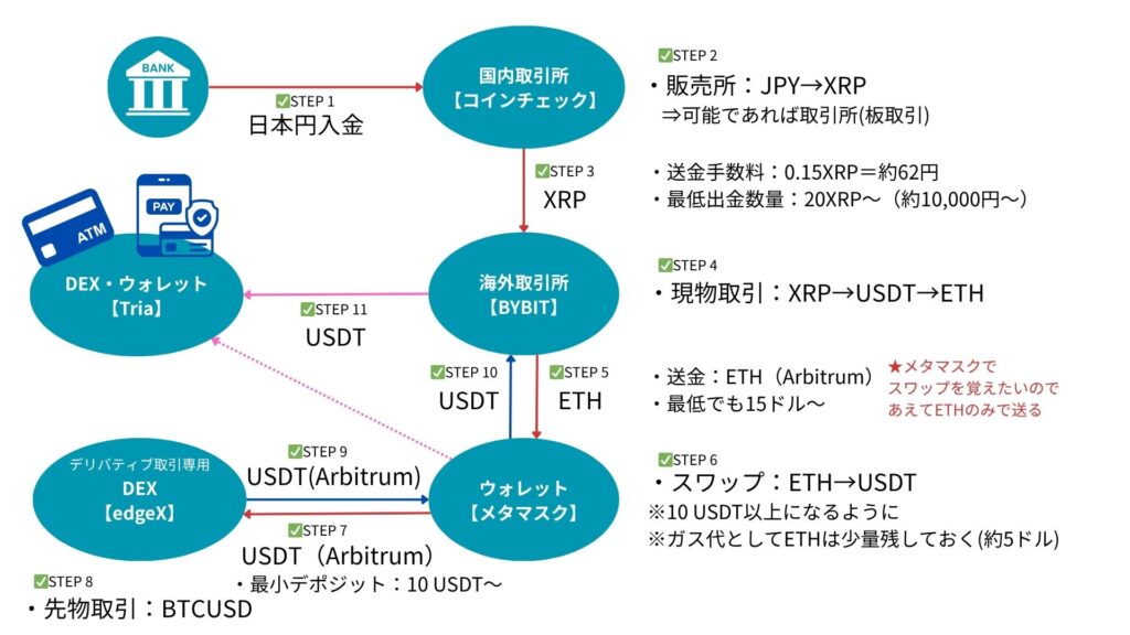 「日本円 → XRP → USDT→ ETH → USDT(Arbitrum)」という順で資金が動いていきます。